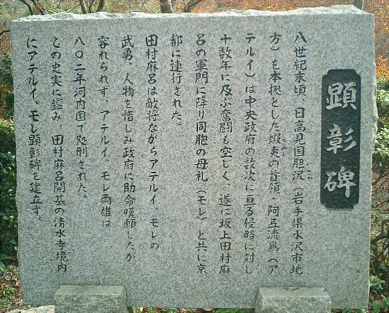 上5枚の写真は、京都清水寺の境内にある「アテルイ・モレの顕彰碑」である。関西の岩手県県人会が建立した。