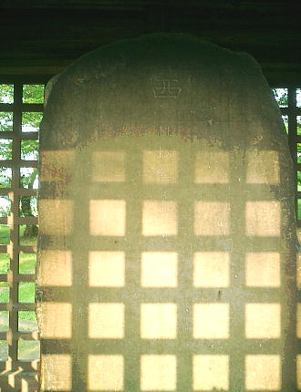 70cmの花崗岩質砂岩で、古い覆屋の中にほぼ真西を向き垂直に立っている。碑面は加工されているが、背面は自然面で