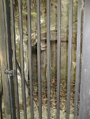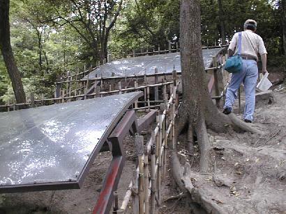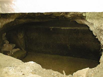 上部が崩れて落ち込んだ横穴。覆いをかけて落下防止してあるが、上部から古墳内部を見ることができる。