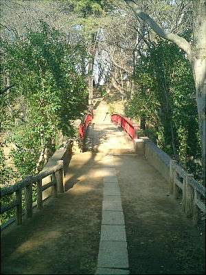 上左の道、谷に掛けられた橋を渡って進むと8(旧、9)号墳を経て宝来山古墳へ至る。