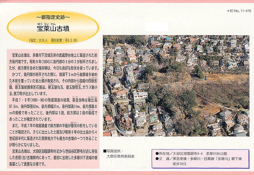 多摩川台公園の西北端にある宝莱山古墳は、4世紀初−中頃の築造と推定され、荏原台古墳群中最古と考えられている。 昭