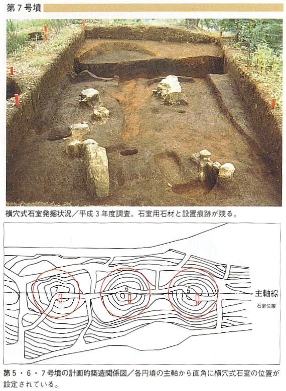 前方後円墳が築造される。6,7世紀には,かって古墳が築造されたこの地域に、円墳で構成される群集墳が形成されるよ