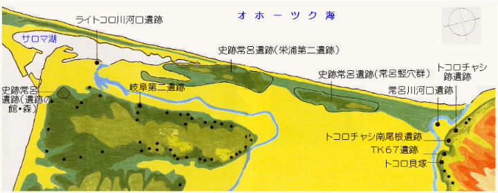 常呂遺跡は、オホーツク海岸に沿って、常呂川河口からサロマ湖東部に至る、湖岸砂丘上に営まれた約1800年前(本土