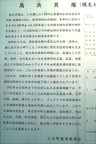 北陸地方における縄文時代の特筆すべき遺跡「鳥浜貝塚」は、福井県三方町の三方駅から西方約1km、三方湖に注ぐ「はす川」