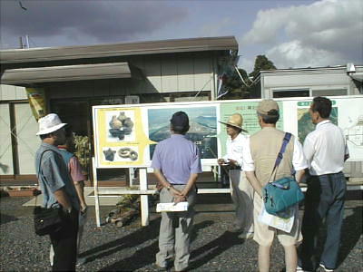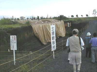 地層の断面は覆いをしておかないと、風雨ですぐボロボロと崩れていくらしい。あまりひどくなると削り直すらしいが、我々はちょうど削った後に来たそうで、くっきりと層の違いが分かった。おじさんが「いやぁ、運のいい人達ですねぇ。」とお世辞をいったが、そうするとこの断面はしまいには削って無くなってしまうんだろうか? まだ見てない人、早くいかなきゃ。