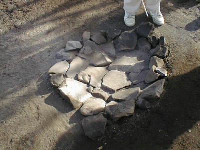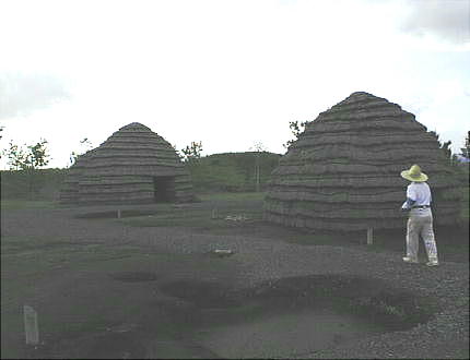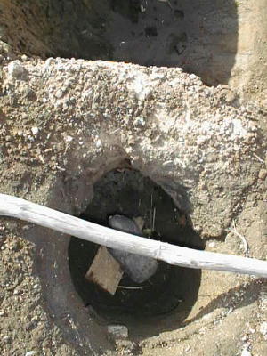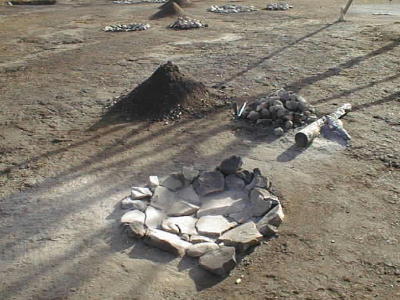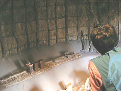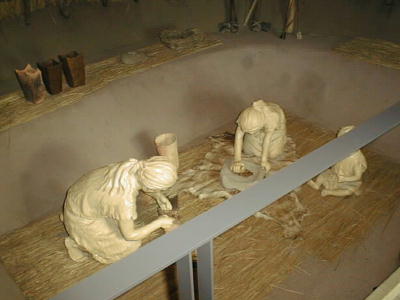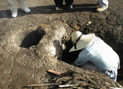 上は発掘時、下はその復元。熱した石を食物と一緒に置き、蒸らして調理したらしい。今でも南方では同じ調理法がある。