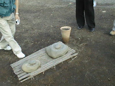 右上写真の左側石臼を、説明してくれたおじさんが発掘した。勿論レプリカ。本物は埋蔵文化財研究センターにある。