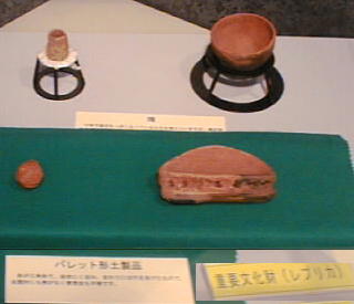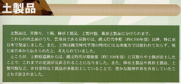 土製品や石製品には、土偶・耳栓(じせん)などが出土した高さ 5.5cm、幅5cm、厚さ1.5cmの板状をなし、頭、腕、乳房