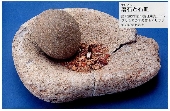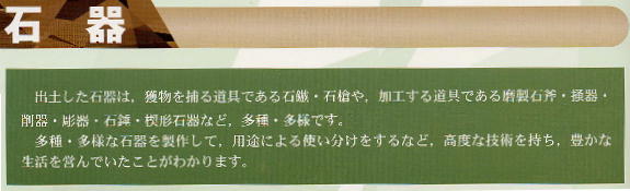 石器は、狩猟用の右舷(せきぞく)、動物解体用の石匙(いしさじ)やスタレイバー、ドングリの調理などに用いられた磨