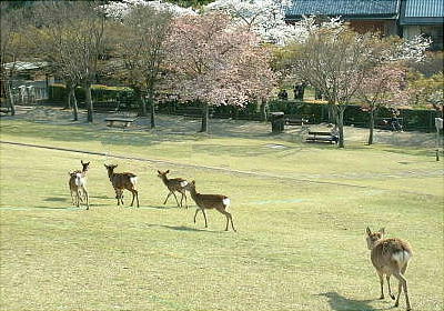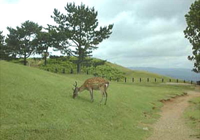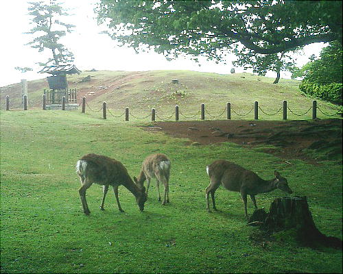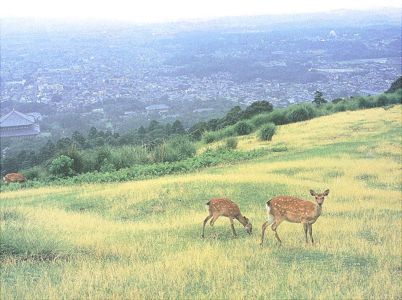 な樹木が無く、低木と草に覆われているので、奈良盆地を一望できる展望が楽しめる。驚くことに、ここにも鹿は登