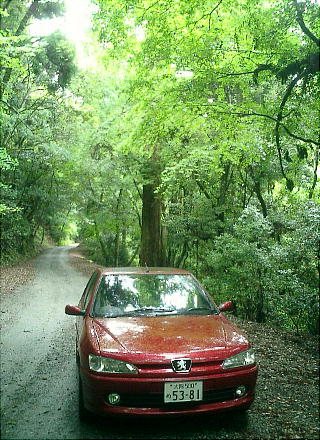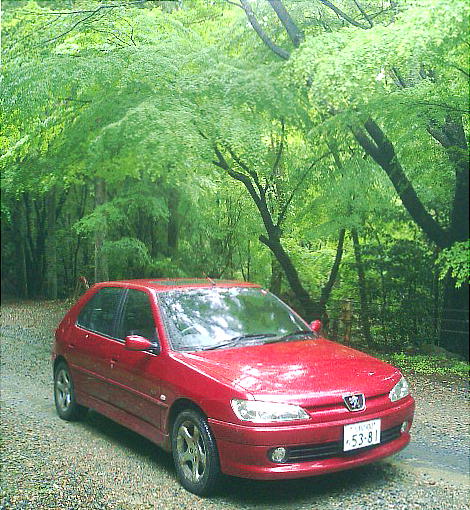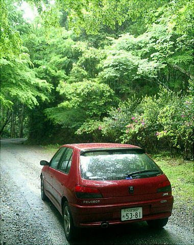 雨の中、文字通り洗われるような新緑の中を行く、我が家のプジョー306。赤と緑の色が鮮やか。