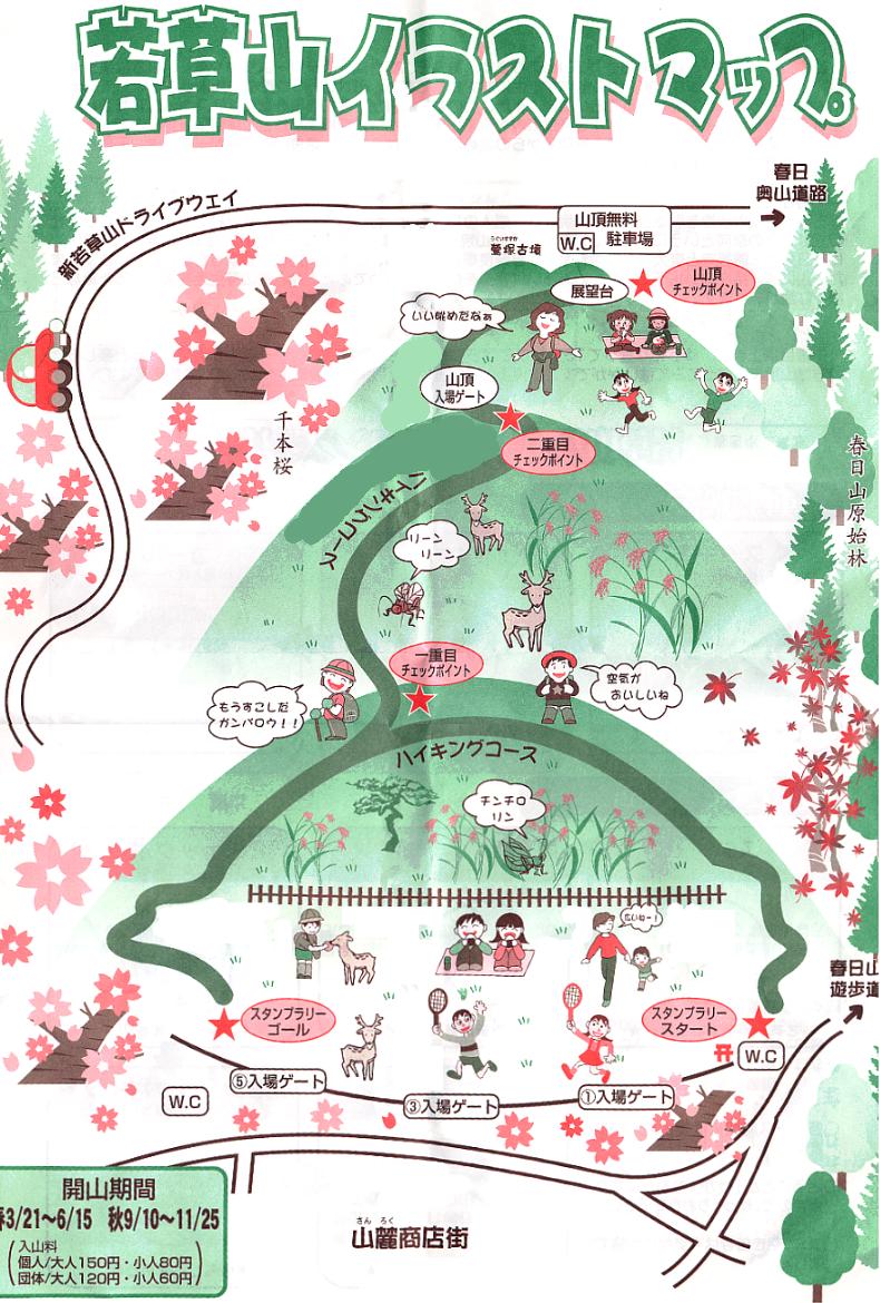 3段からなる山で、昔は若草山を「三笠山」と言っていた。入山料150円を払って頂上(標高308.6m)から、