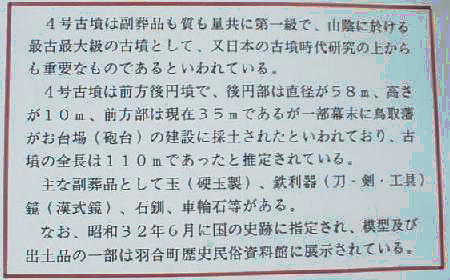 ら副葬品の多くは羽合町歴史民俗資料館で見ることができる。墳丘の施設、石室の構造、副葬品の組み合わせなどから、近