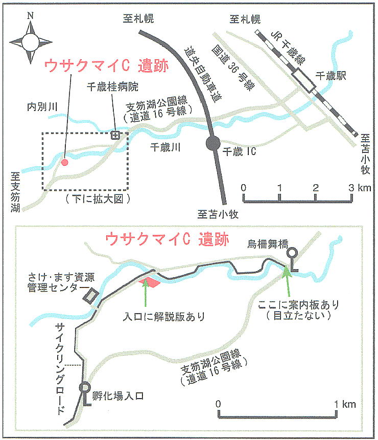 ら北海道中央バス「支笏湖行」に乗り、「サケ・マスふ化場前」で下車すると、徒歩10分ほどで「ウサクマイC遺跡」の説明