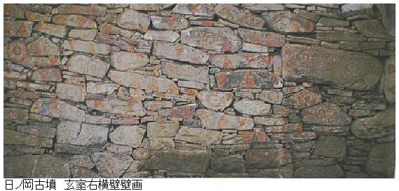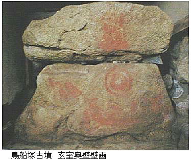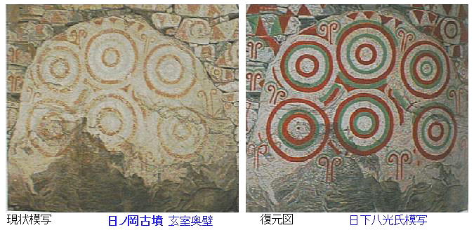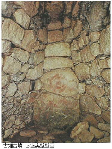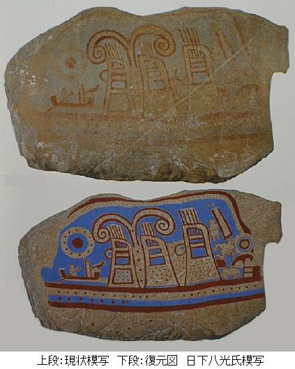 壁画は同心円とワラビ状の文様が中心だが、太刀や、盾、船や魚、獣も描かれている。