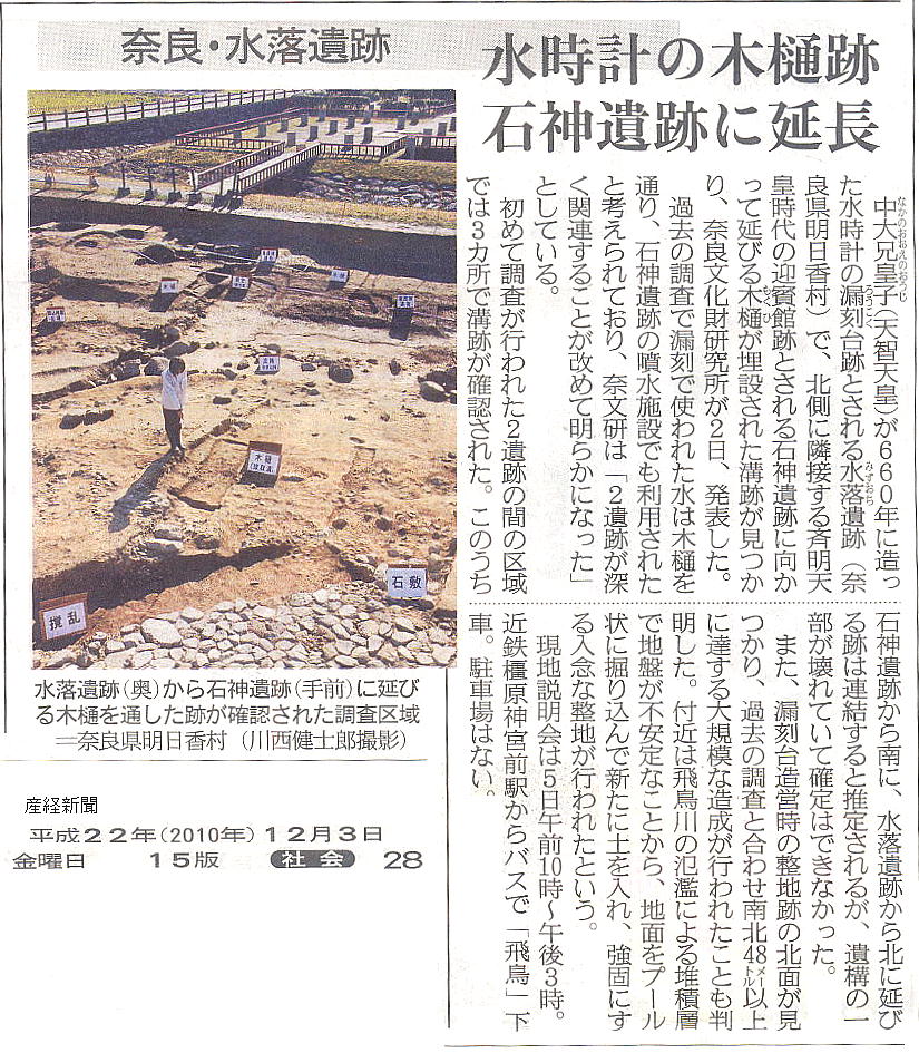 隣接迎賓館へ水流す? - 最古の水時計跡/明日香・水落遺跡2010年12月3日 奈良新聞