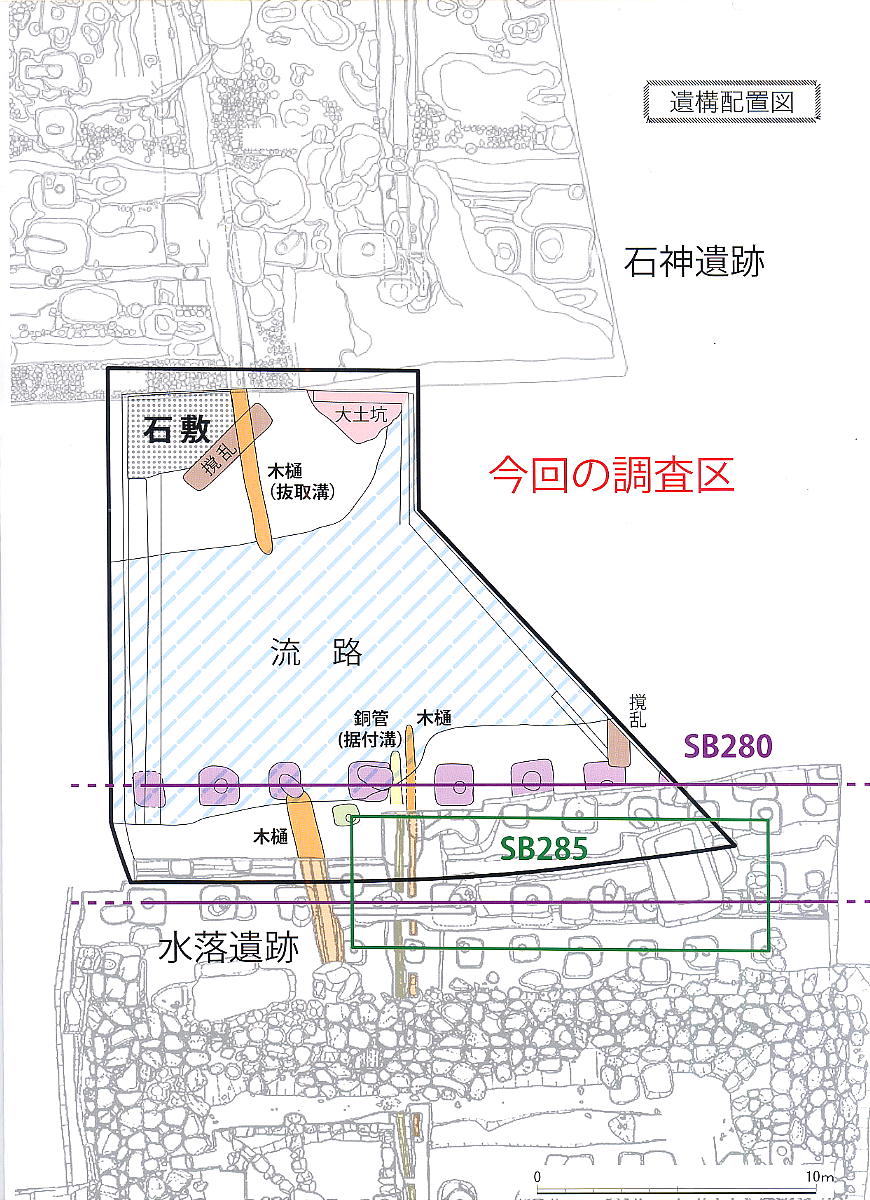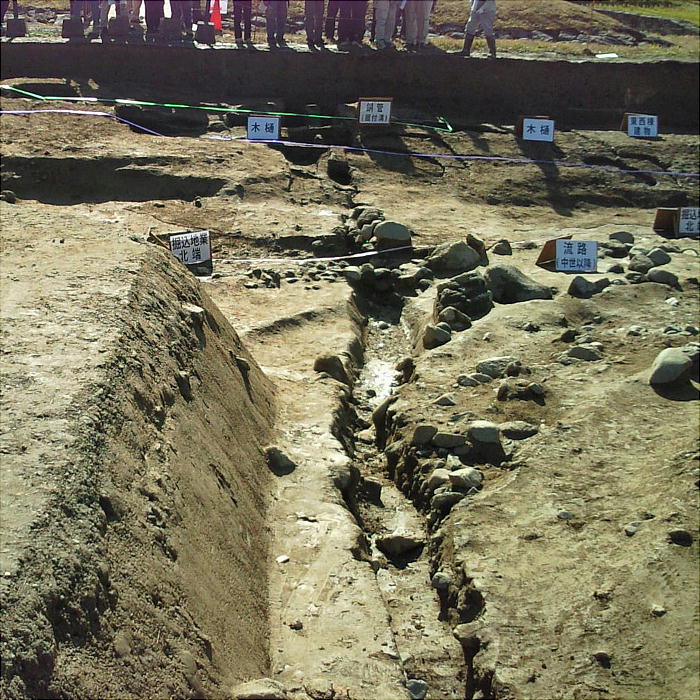 も中世以降の水流で消滅し、石神遺跡から南向きに延びる水利設備との接合は確認できなかった。