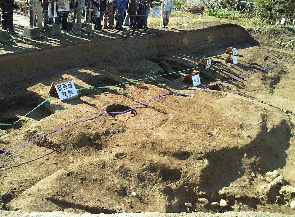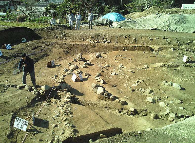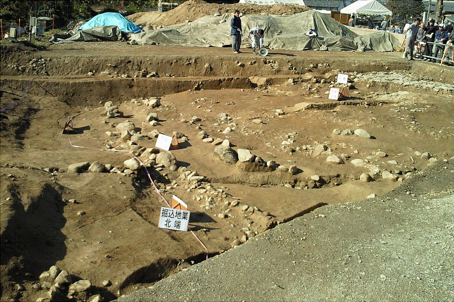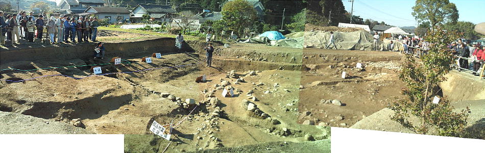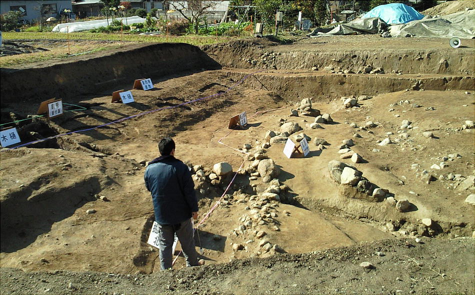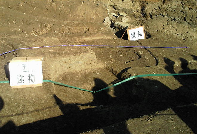 ある四角い土壇に、4間四方の楼状建物が建っていた。土壇をつくる途中で礎石を据え、礎石間には自然石を連結した、地中梁工