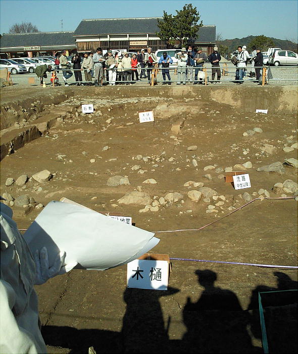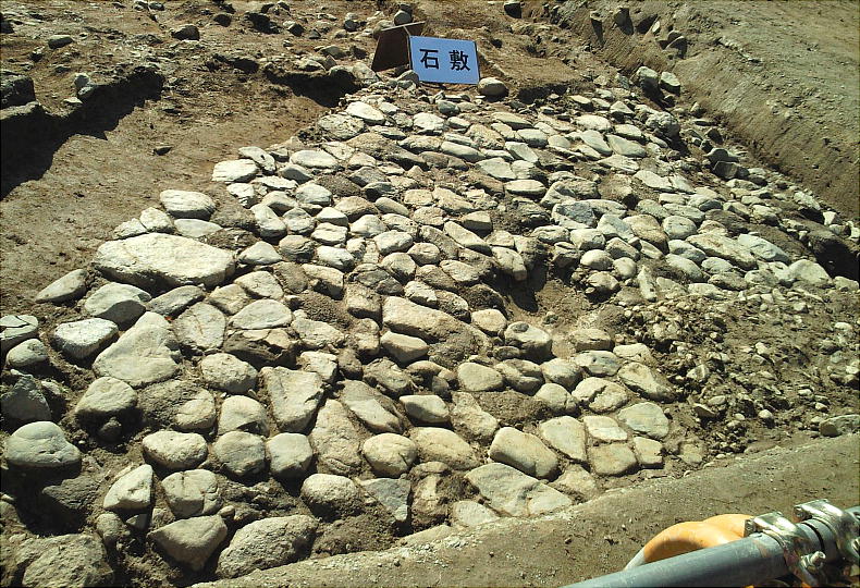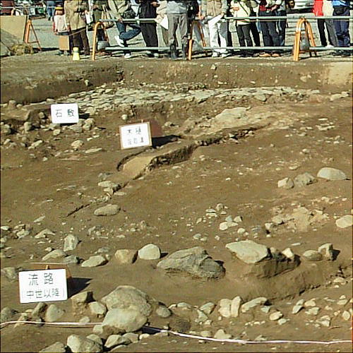 この石敷きは何のためか聞き忘れた。小さな池でもあったんかね。それとも建物の沈下防止かな。それならもっと下にありそうだが。