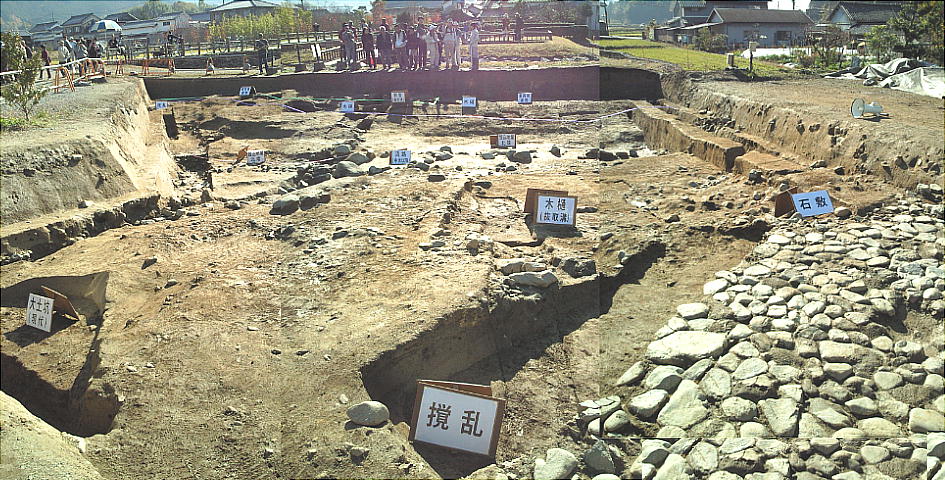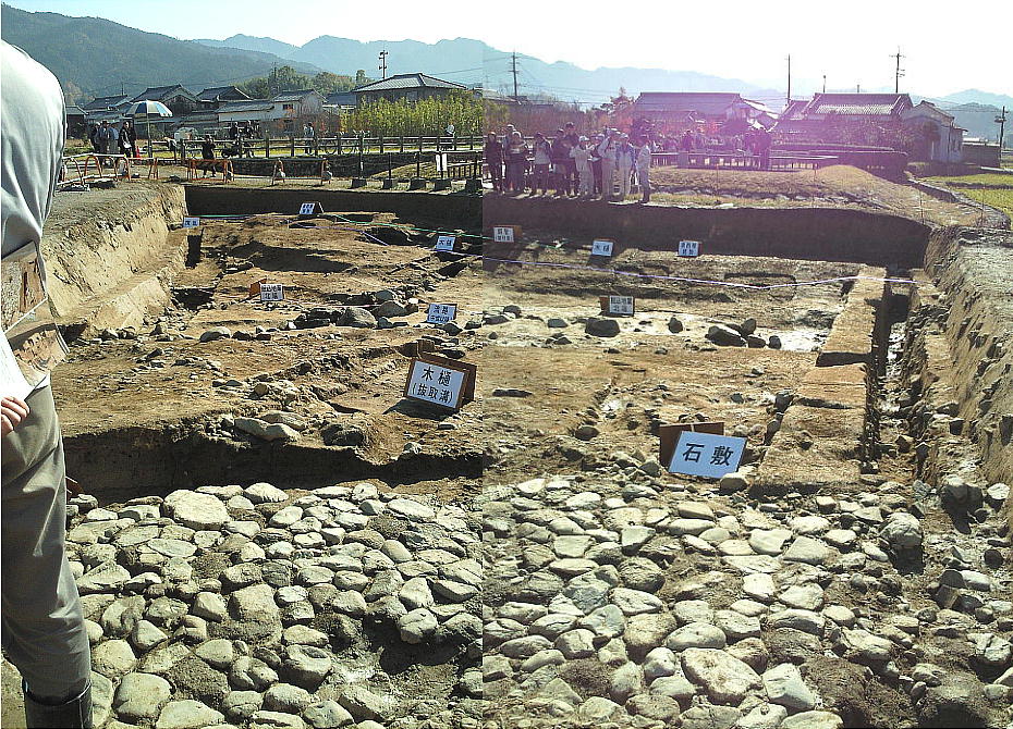がみつかっている。隣に時計台がそびえていた斉明天皇の時代には、整然と並ぶ長い建物群、石敷をもつ立派な井戸、石敷広場な