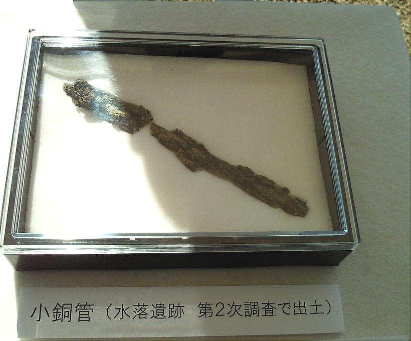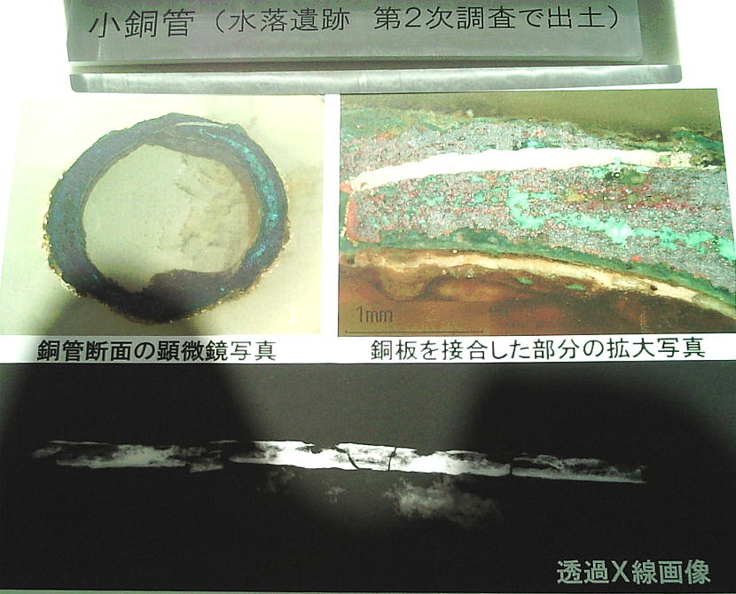 水落遺跡では、全ての柱が抜き取られており、残っていたのは、木樋、漆塗の木箱、銅管等であった。ラッパ状銅管も、木樋の蓋