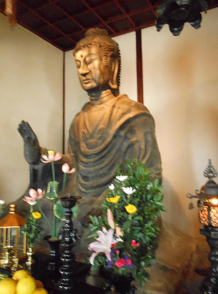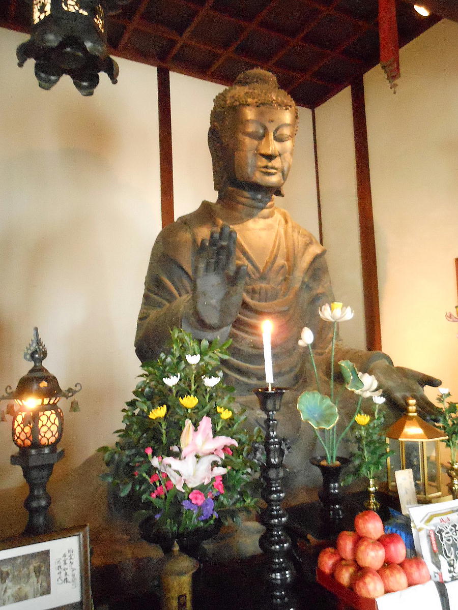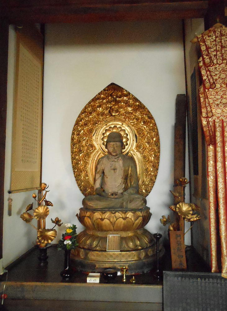 (表面の仕上げがされていない)で後世のものと思われ、脚部は銅の上に粘土で衣文をつくっており、左手は木製のものを差し込んで