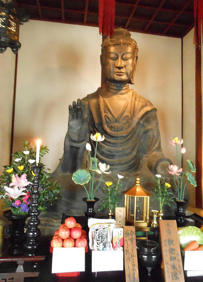 『日本書紀』『元興寺縁起』に見える、鞍作鳥(止利仏師)作の本尊像であるが、後述のとおり損傷が激しく、後世の補修を受けてい