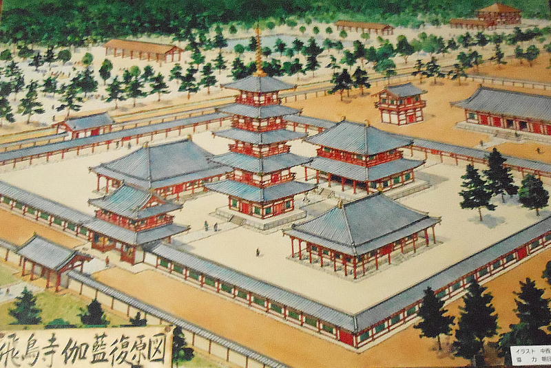 が取り付くのに対し、飛鳥寺では仏の空間である回廊内の聖域と、僧の研鑚や生活の場である講堂その他の建物を明確に区切っていた
