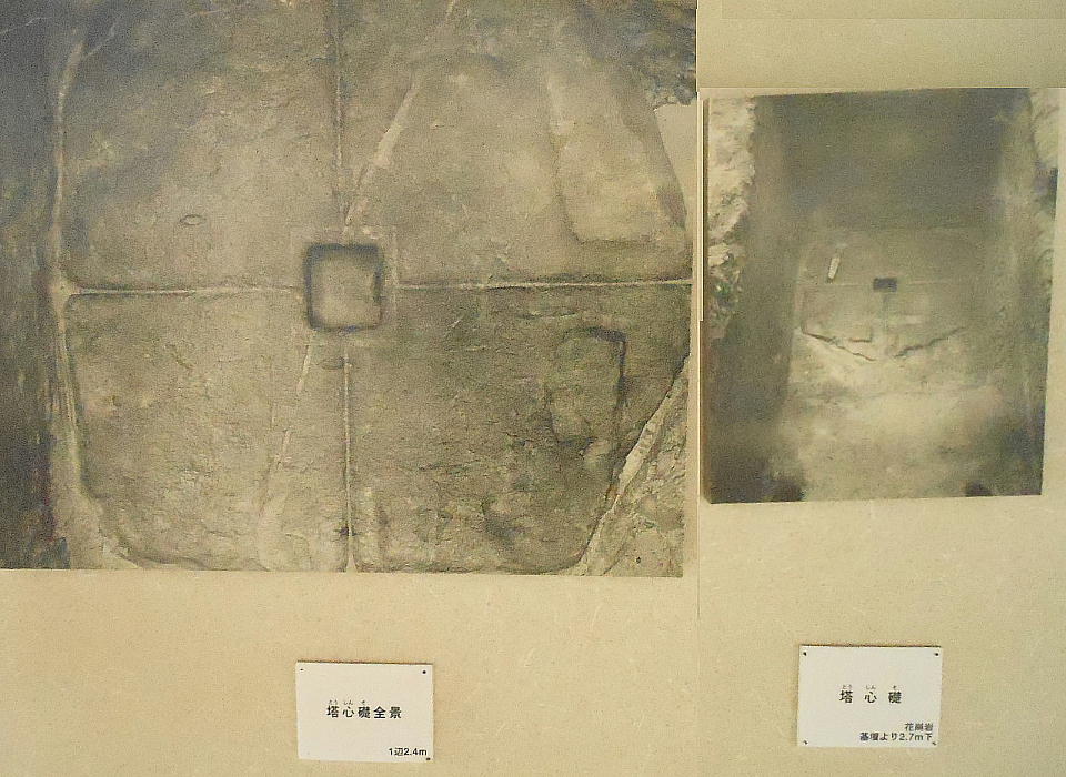 残っていなかった。心礎は地下2.7mに据えられ、中央の四角い孔の東壁に舎利納入孔が設けられていた。舎利容器は建久7年