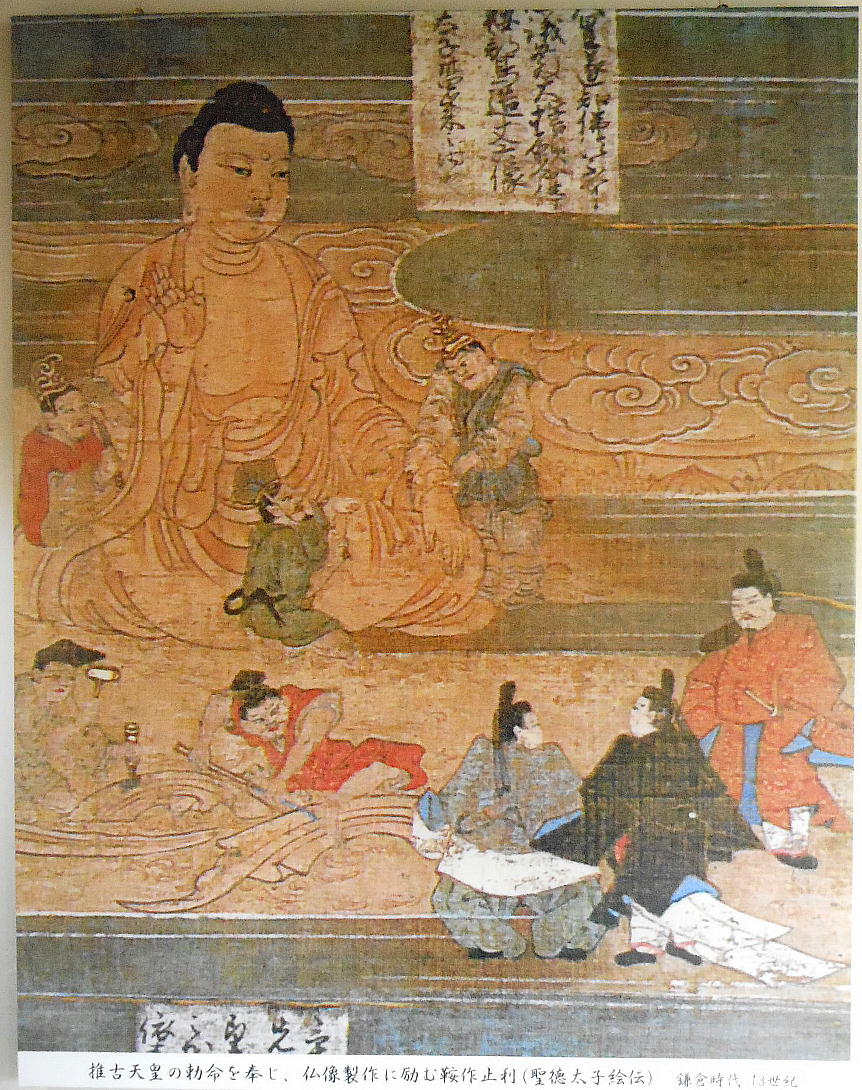 『書紀』によれば、推古天皇13年(605年)、天皇は皇太子(聖徳太子)、大臣(馬子)、諸王、諸臣に詔して、銅(あかがね)