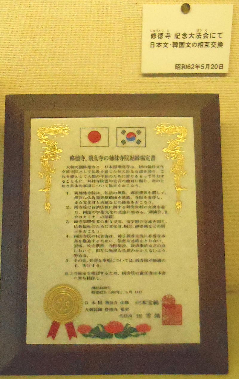 黄金三百両が貢上されたという。『書紀』によれば、銅と繍の「丈六仏像」は翌推古天皇14年(606年)完成。丈六銅像を元興寺
