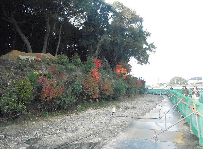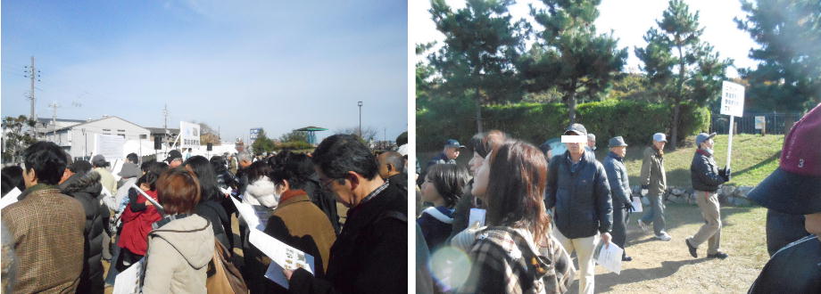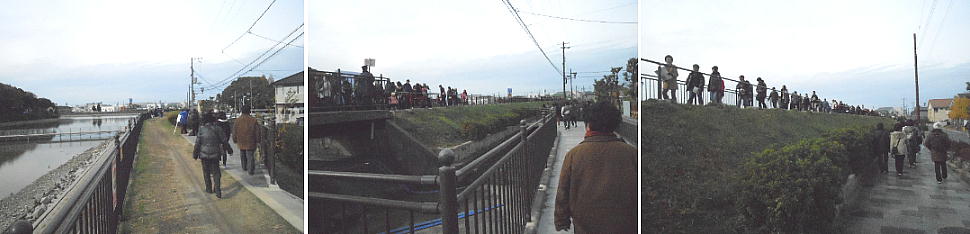 堤防の上と下で、今から見学する人と戻ってゆく人がすれちがう。