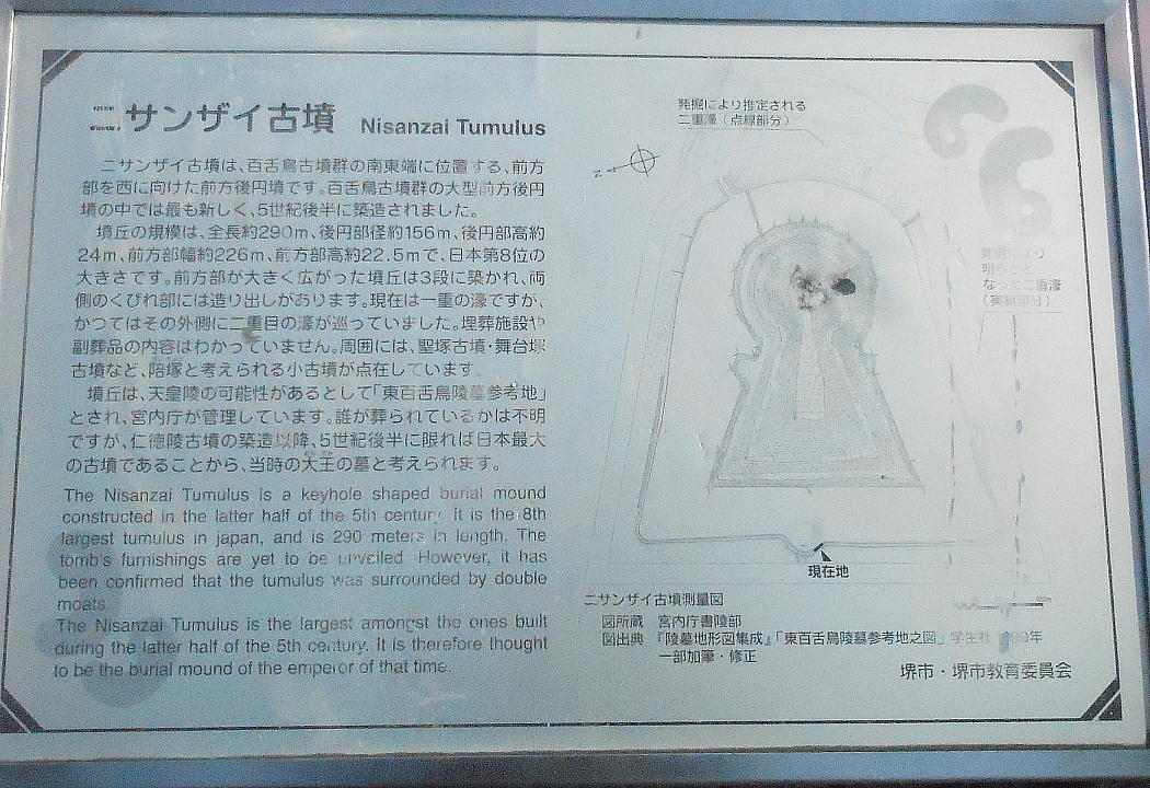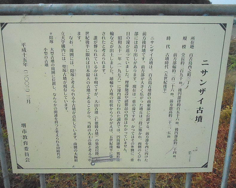 ”ニサンザイ”は”ミサンザイ”すなわち”ミササギ(陵)”の転訛したものと考えられており、宮内庁が「東百舌鳥陵墓参考地」