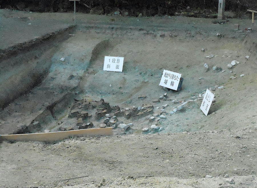 葺き石の下まで埴輪が転げ落ちて来ている。