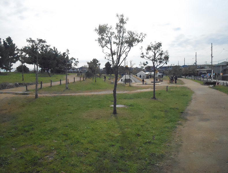 ここはニサンザイ古墳の前方部堤防下に作られた公園である。ブランコや滑り台に混じって、埴輪のレプリカが点在している。