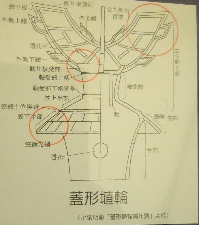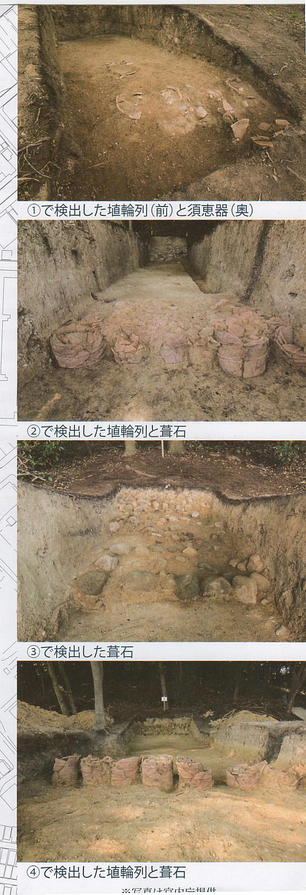 面に張られた葺(ふ)き石などが確認された。埴輪には円筒埴輪や朝顔形、蓋(きぬがさ)形があり、須恵器の甕(かめ)や土師器