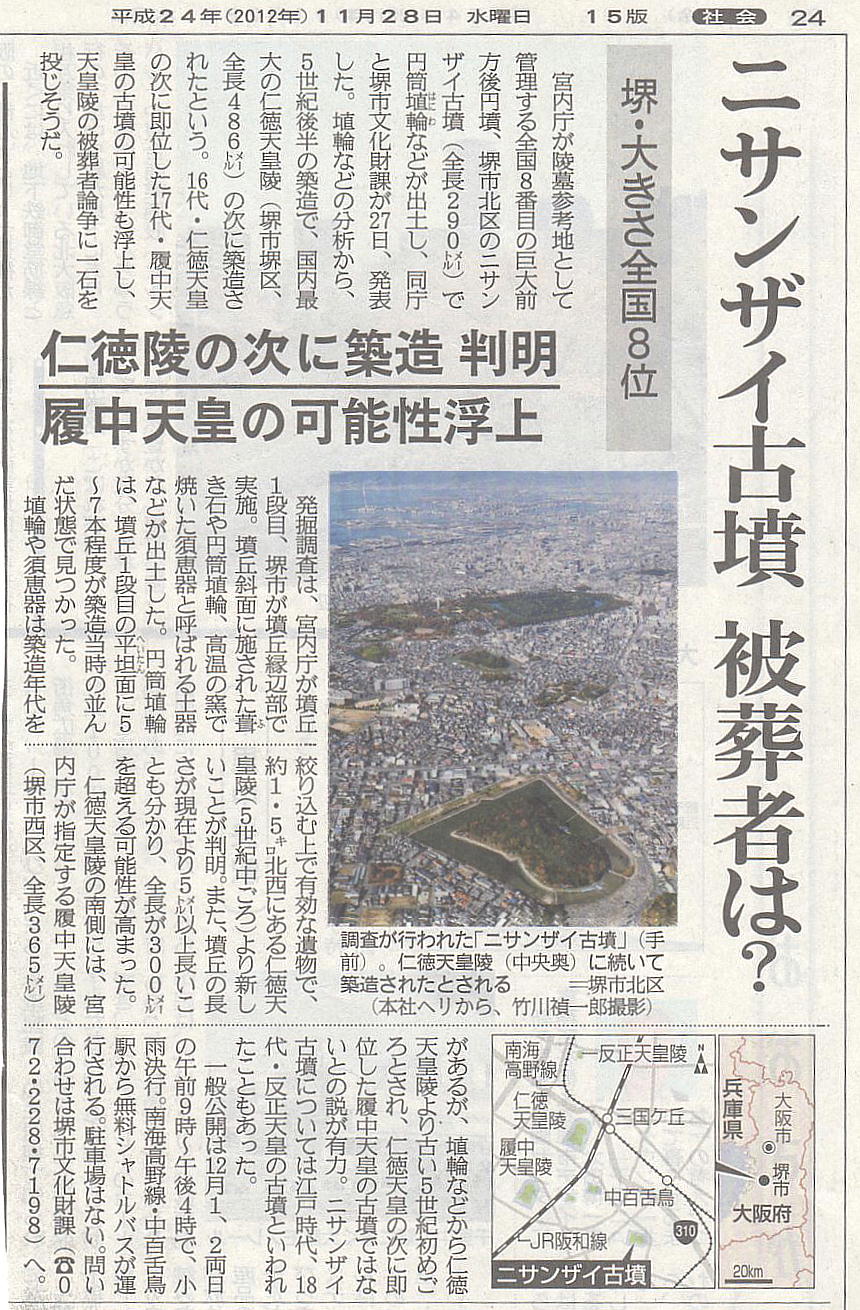 ニサンザイ古墳:全長300メートル全国7番目「大王墓」説に手がかり 堺 (毎日新聞 2012年11月28日 大阪朝刊)