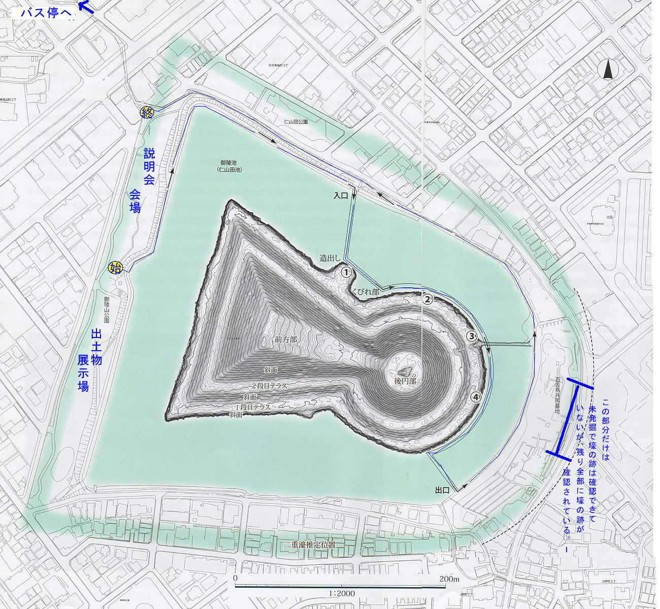 F.外側にもう一つの外壕があった事は、後円部突端を除き、すべて堺市の発掘調査で判明している。
