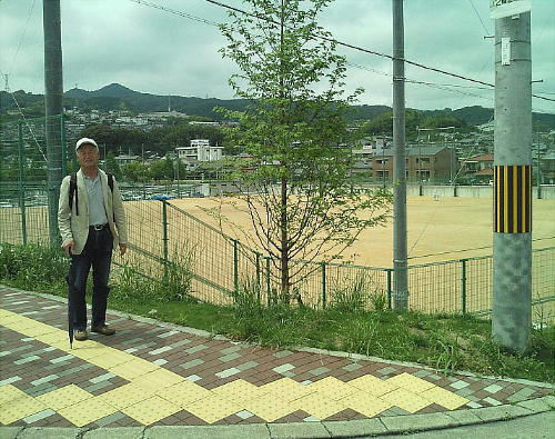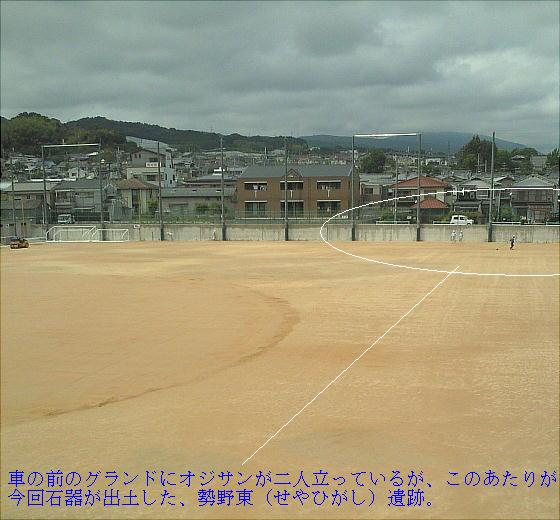 杉本さんの立っている後ろのグラウンドが、今回(といっても1年前だが)石器発見の「勢野東(せやひがし)遺跡」である。