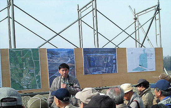 説明する橿原考古学研究所卜部さん。まずここで説明を聞いて、それから発掘現場へ向かうようだ。