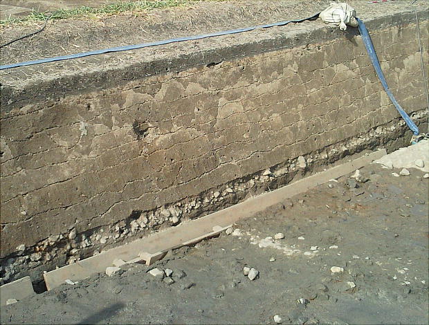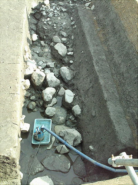今でもひんぱんに水が湧き出ている。発掘にはじゃまなのでポンプで吸い出している。