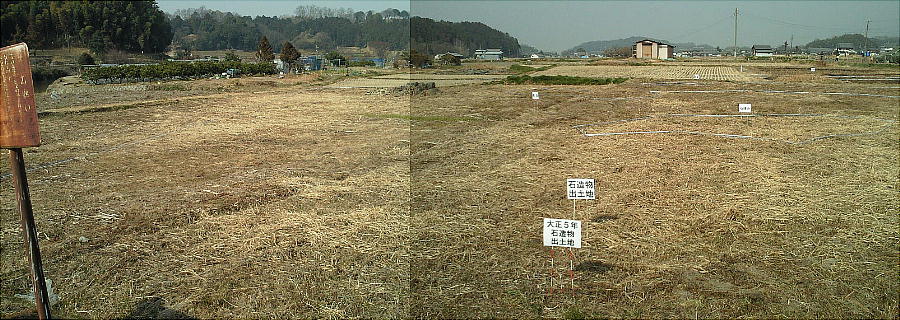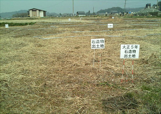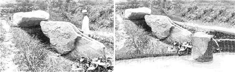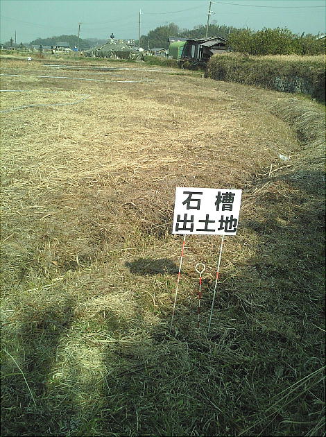 大正五年(1916)にこの水田から二つの石造物が出土した。一つは平らな形で(長さ2.2m、幅1.7m)、あんぱんをつぶしたよう