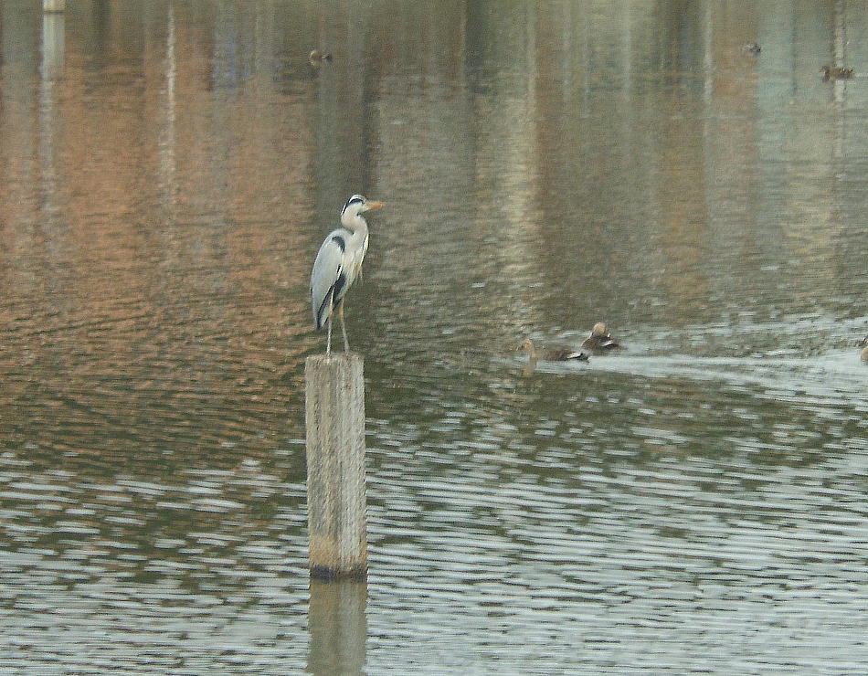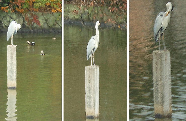 剣池へ来るとたくさんの水鳥たちが池に群れていたので、しばしBird Watchingを楽しむ。杭の上にアオサギがいた。