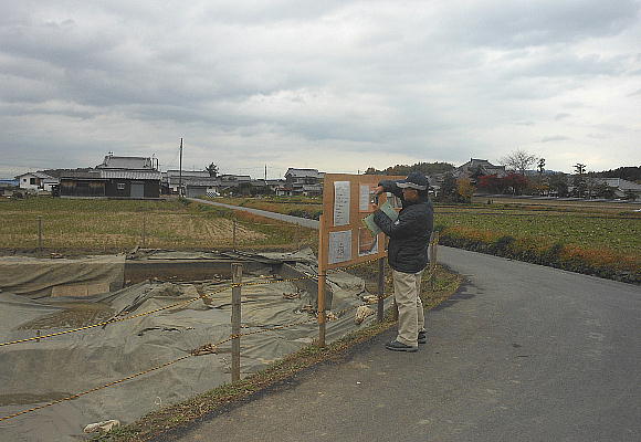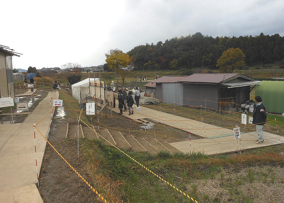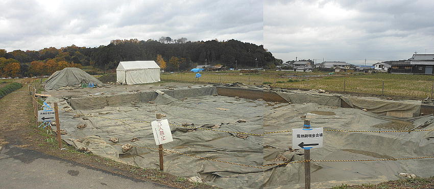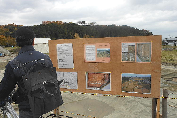 紅葉の脇に「現地説明会場」の案内があった。集落を抜けたんぼ道を行くと発掘現場があった。