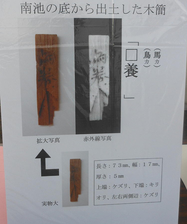 津皇子」「大来」等と書かれた墨書木簡が出土している。「辛巳年」は 681年、「大来」は大津皇子の姉の大来(伯)皇女の名と推定