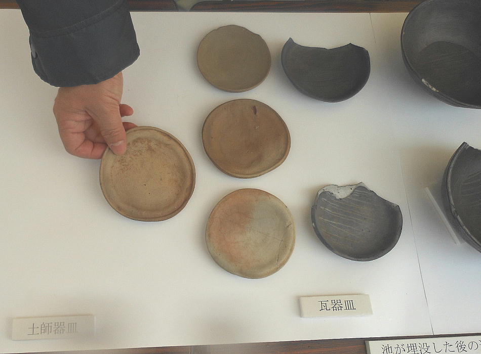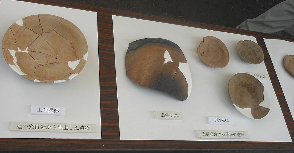 10世紀代の土器、最上層には13世紀代の瓦器が包含されていた。このことから苑池は平安時代までは滞水しており、鎌倉時代中期に