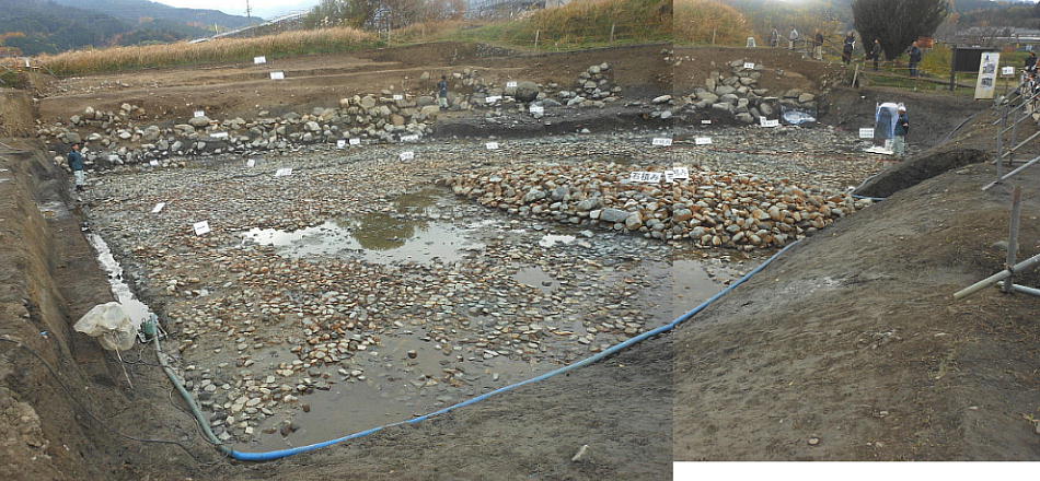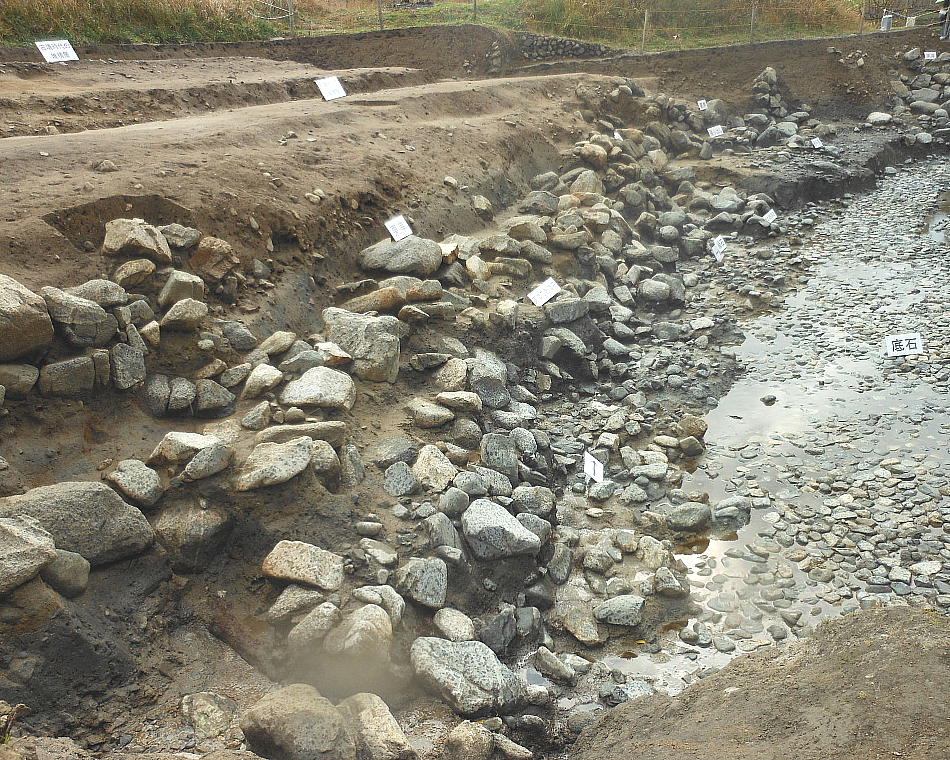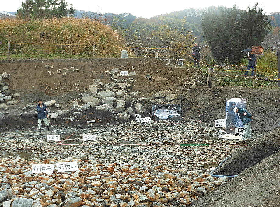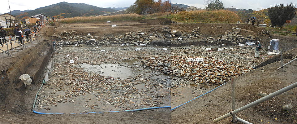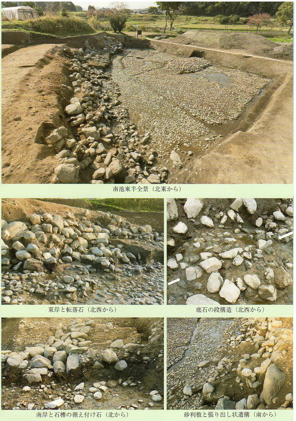 一連に組み合わされて南方からの流水施設となることもわかった。池底には厚さ1mの有機質層が堆積しており、最下層の石敷き上には