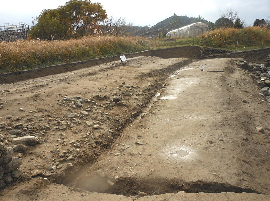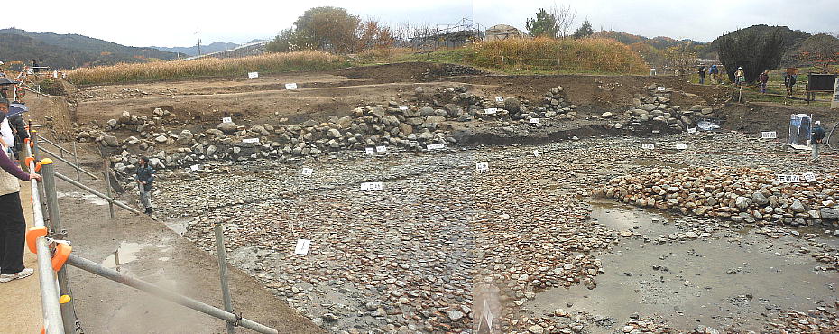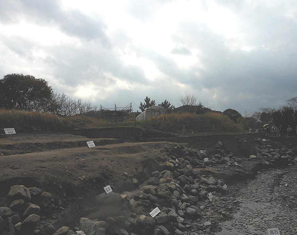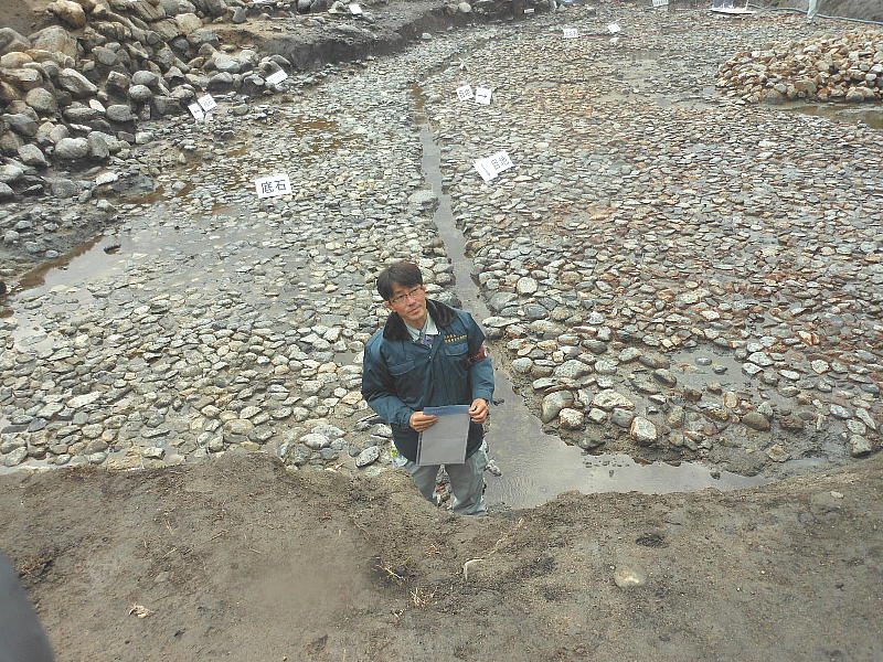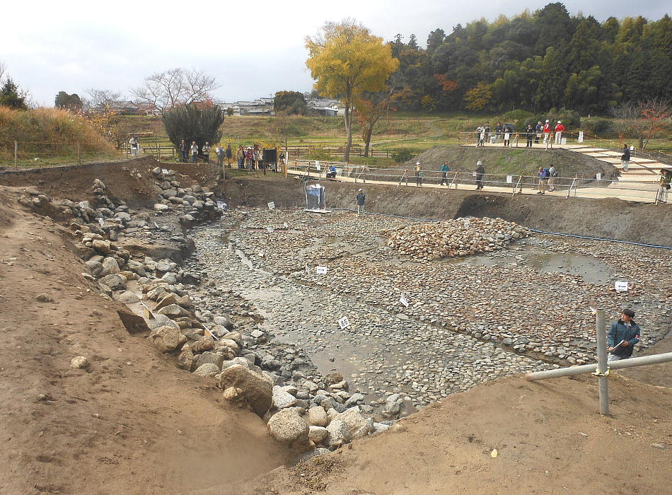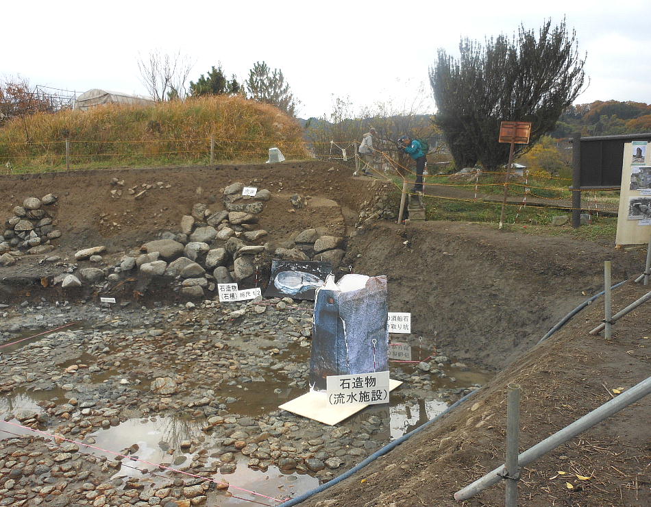 一連に組み合わされて南方からの流水施設となることもわかった。池底には厚さ1mの有機質層が堆積しており、最下層の石敷き上には