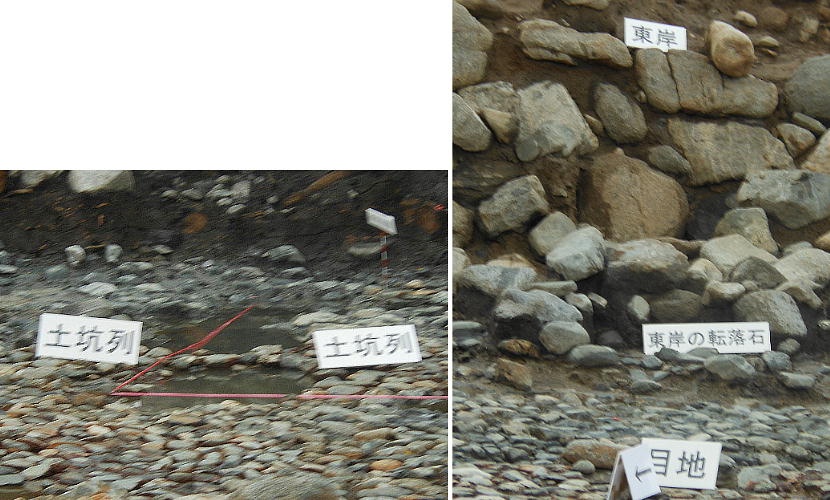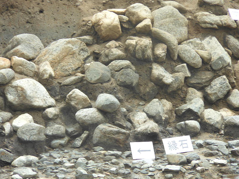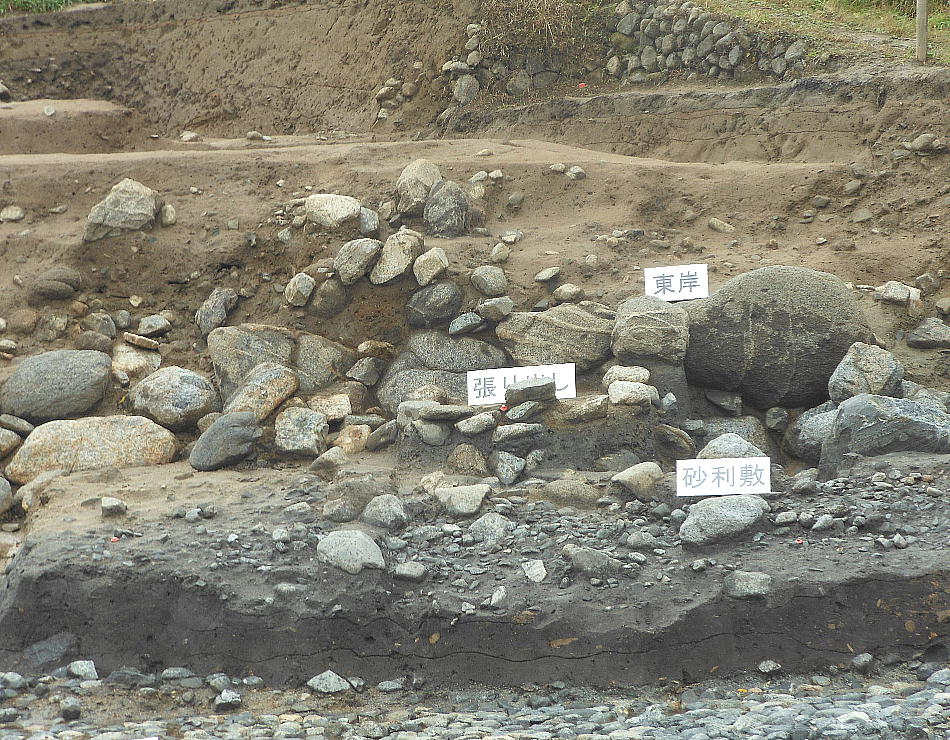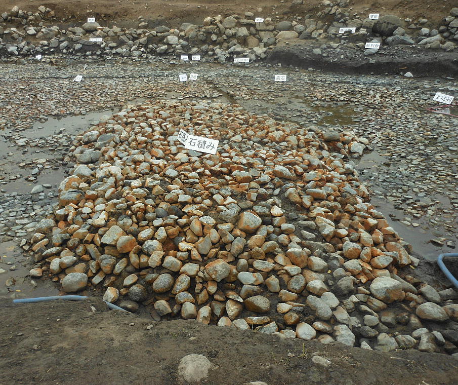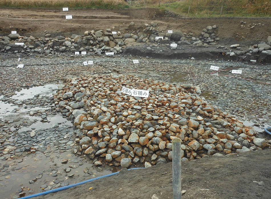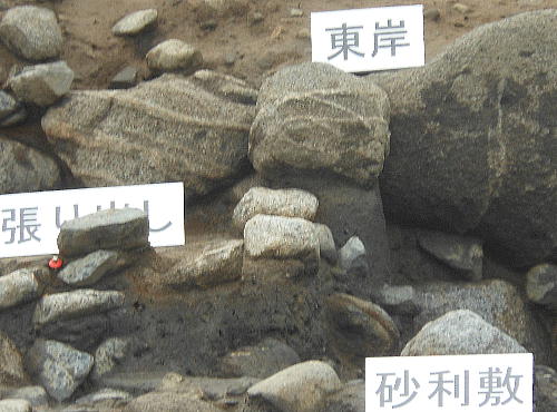 に1層の石敷きが施されていた。また護岸石垣に接して柱が1本と、柱を抜き取ったとみられる坑が5箇所確認された。