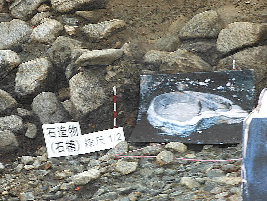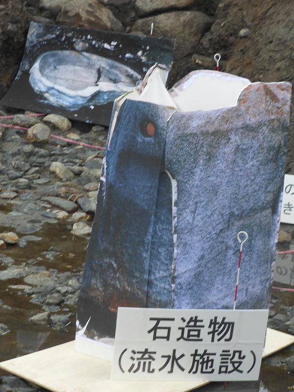 孔径9p。石造物2は、平らな石塊の内側を槽状に刳り抜いたもので、水を溜めて流す装置と考えられる。長さ約270p、幅約200p、厚さ60